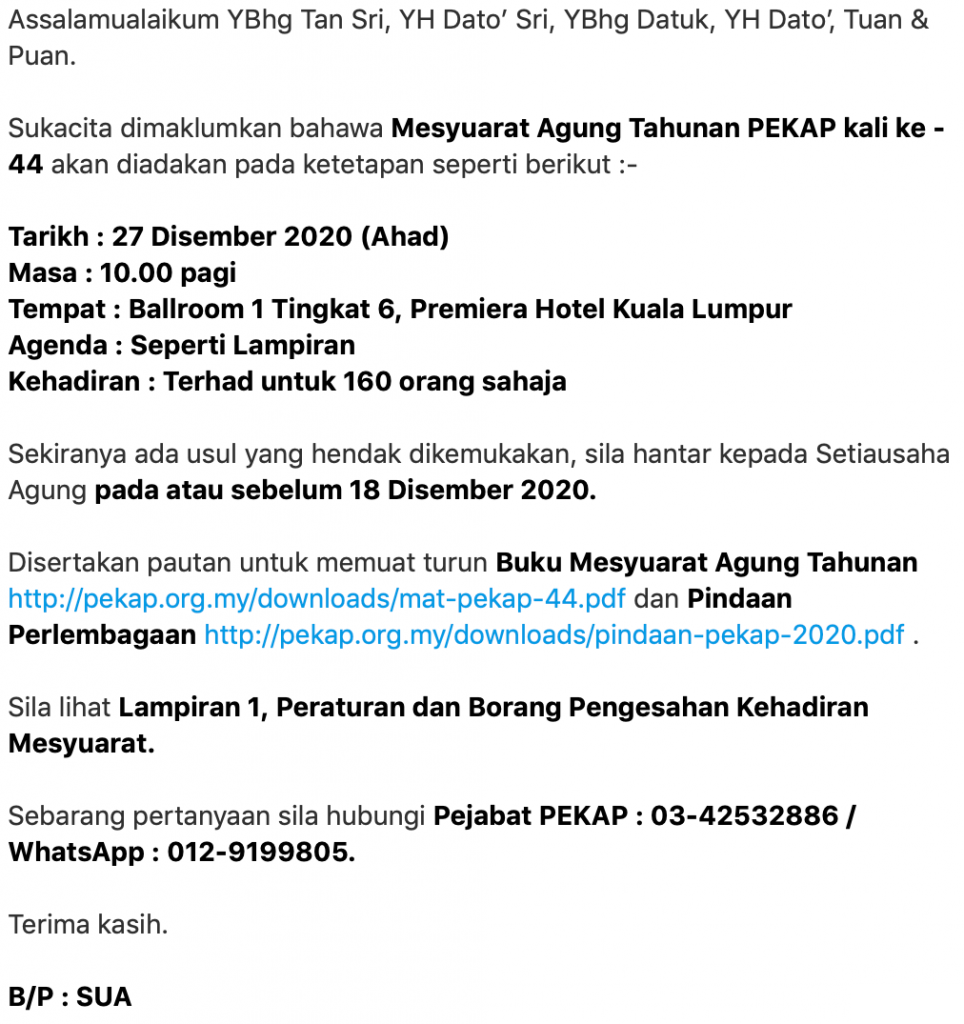 PEKAP LEARN MORE “Persatuan Kebajikan Anak – Anak Pahang Di Ibu Kota (PEKAP) merupakan sebuah persatuan yang ditubuhkan khas buat warga Pahang yang bermastautin di Kuala Lumpur. ” – PEKAP UPCOMING EVENTS Buku Mesyuarat Agung Tahunan Pindaan Perlembagaan